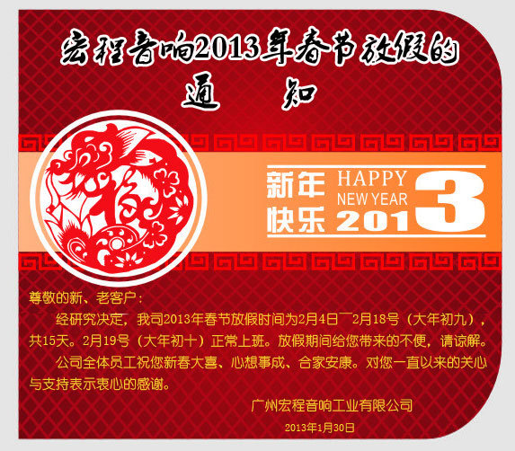 经研究决定,我司2013年春节放假时间为2月4日~2月18号(大年初九),共15天。2月19号(大年初十)正常上班。放假期间给您带来的不便,请谅解。