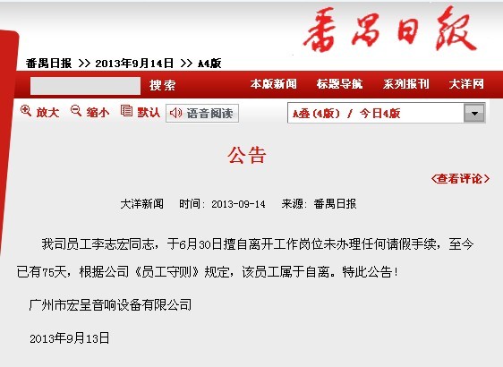 我司员工李志宏同志,于6月30日擅自离开工作岗位未办理任何请假手续,至今已有75天,根据公司《员工守则》规定,该员工属于自离。特此公告!
