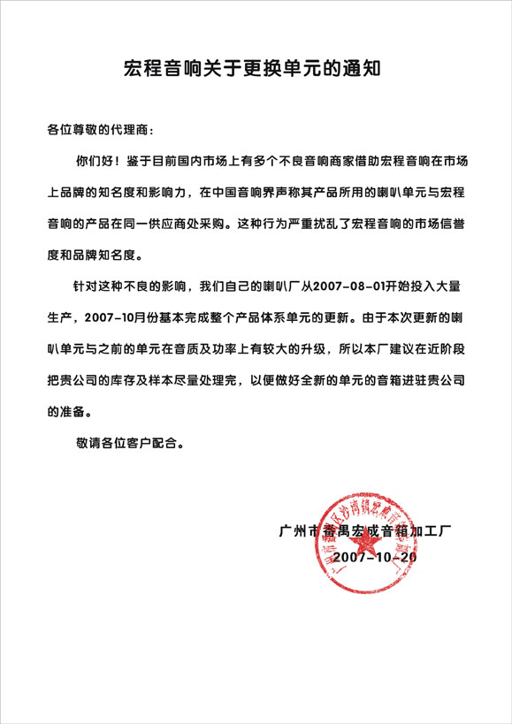 | 宏程音响关于更换单元的通知 |